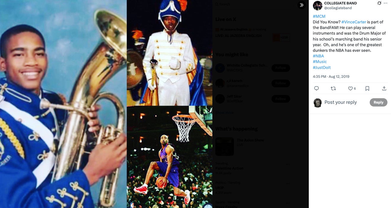 NBA Hall of Famer Vince Carter seems like a great pick for this issueâs spotlight. In addition to a 22-year NBA career, Vince Carter is also an accomplished musician who served as drum major in high school. In other words, he was the one out front of the marching band. But leading a band only works if there is a band to lead, so Carter is a great example of the help needed to stand alone!